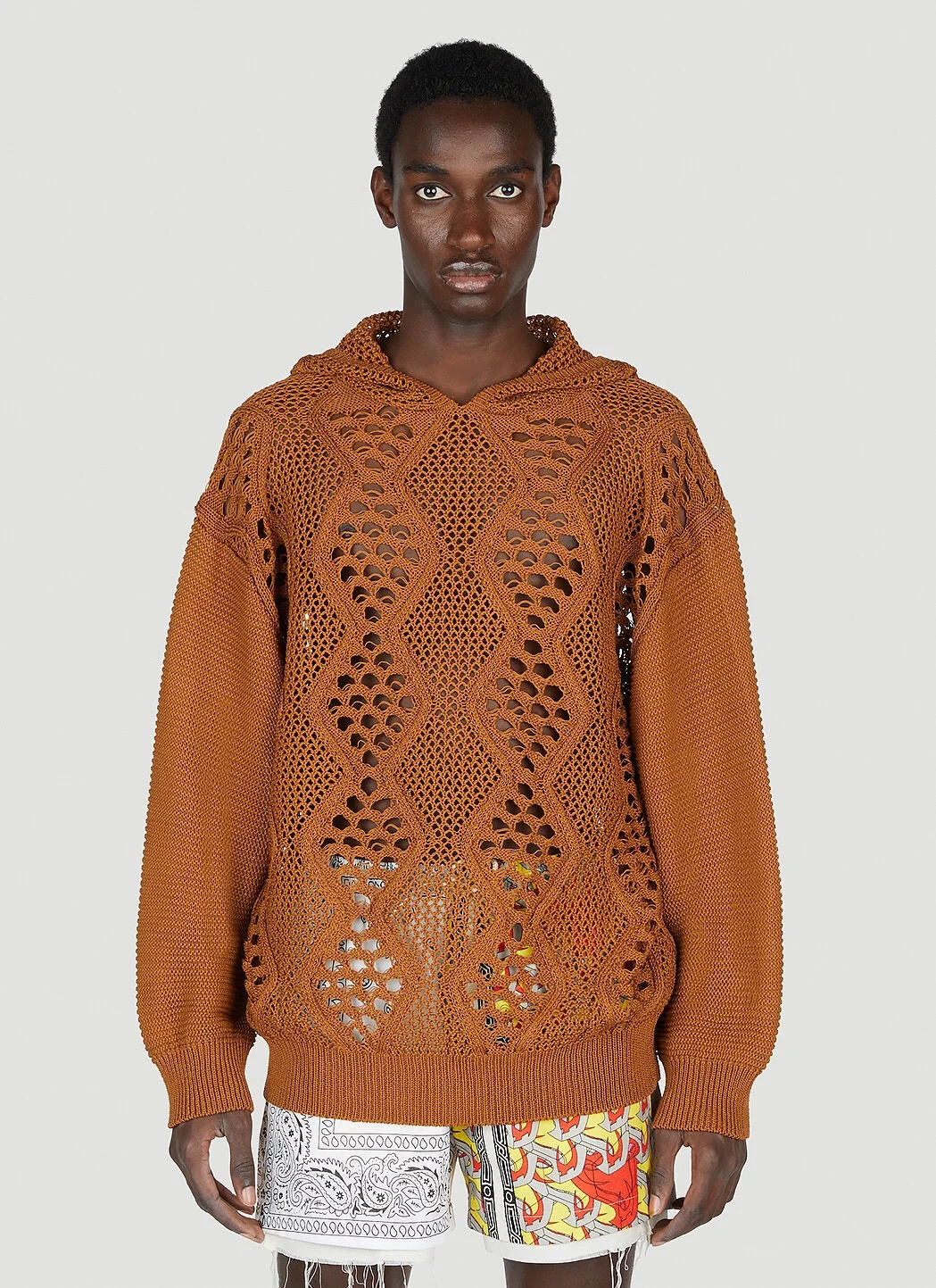 Cotton knit hooded sweater. - Hood - Long sleeves - Front and rear open knit construction - 100% Cotton. Machine wash cold - Color: Brown - Code: COTDKN-663 BROWN