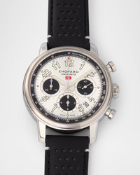 Chopard men's chronograph watch Approx. 40.5mm round case Stainless steel case and buckle Twotone "La Gara" dial with a circular satinfinish silvertoned background Luminescent hands and Arabic numerals Three black subdials; Tachymeter inner bezel Matte black perforated calfskin leather strap Adjustable length; thorn buckle Waterresistant to 50 meters Seethrough case back Made in Germany