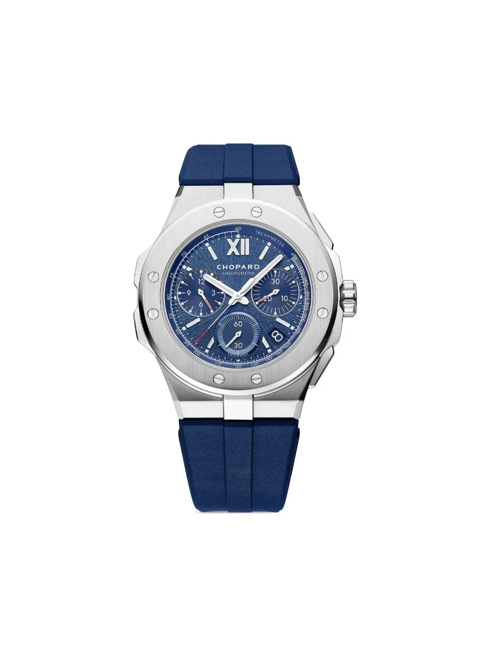 Alpine Eagle XL Chrono 44mm Founded in 1860 in Switzerland, Chopard is renowned for its refined timepieces. Inspired by Karl-Friedrich Scheufele's passion for the Alps and the power of the eagles that can be found there, the Alpine Eagle model is a modern reinterpretation of the emblematic St. Moritz - first seen in 1980 and the first watch ever created by the brand's co-president. Powered by precise mechanical movement, this Alpine Eagle XL Chrono 44mm is equipped with three chronograph counters, encapsulated in a durable Lucent steel case. Highlights - 44mm - Navy blue - Lucent steel - Round face - Roman numeral dial - Baton hands - Chronograph counters - Date indication - Screw-down crown - Rubber strap - Pin-buckle fastening - Automatic movement - Water resistance up to 100m/10 atm - This item comes with a standard two-year warranty from the brand. - This item is crafted using fairmined certified gold, ensuring that artisanal and small scale mining organisations meet high standards for social development and environmental protection. - Learn more about what makes a product conscious on our conscious criteria page Imported Composition Stainless Steel 100%, Rubber 100% SIZE & FIT Measurement Case size 1.7 in(44 mm)