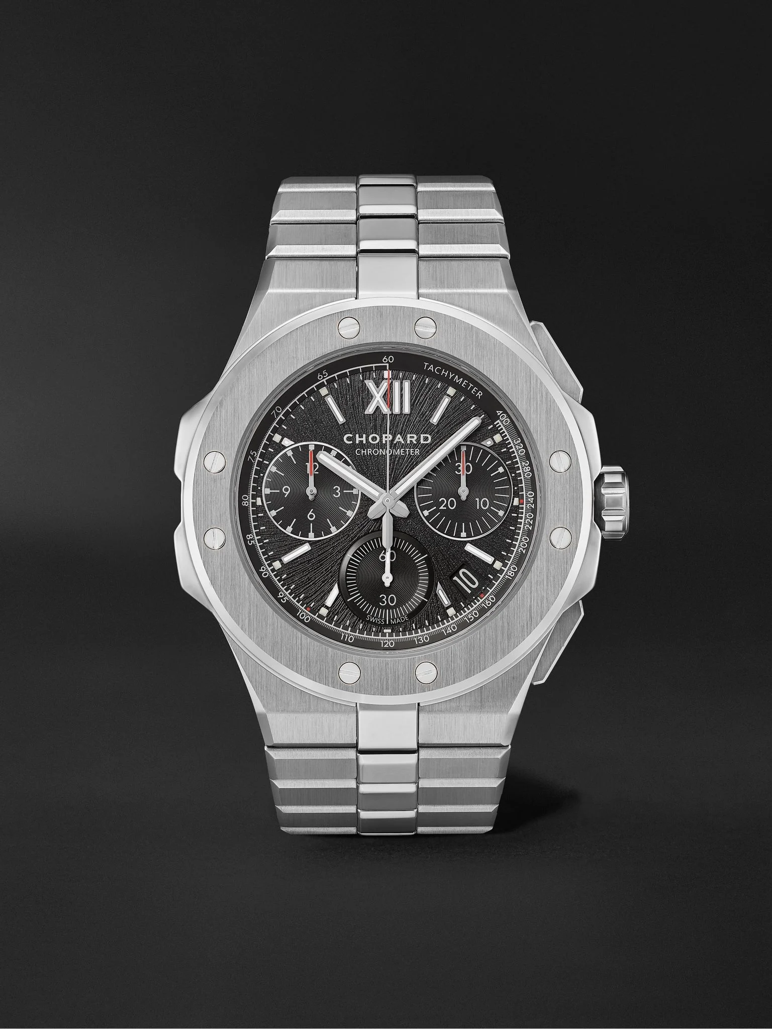 Mr Karl-Fritz Scheufele was thinking of three things when he imagined Chopard's 'Alpine Eagle' watch: his love for the Alps, the region's native golden eagle and the 'St. Moritz' timepiece his father created in 1980, which serves as the basis for this chronograph. The Maison spent four years developing the Chopard Lucent Steel A223 that's used for the case and bracelet - it's inspired by the strength of the mountains and is, fittingly, brighter and 50% harder than other variations. The galvanised dial, meanwhile, is modelled on the bird of prey's iris, the second hand fluted like a feather and the crown engraved with a compass rose. We offer a two-year warranty for all working parts and manufacturing faults for luxury watches. For more information, contact one of our experts by emailing watches@mrporter.com Details & Care Movement - Swiss-made calibre Chopard 03.05-C automatic chronograph movement with 60-hour power reserve - 45 jewels, 28,800 Vph Functions - Hour, minute and second hands - Date window - Flyback chronograph: small seconds, 30-minute and 12-hour counters, jumping minute counter - Tachymeter scale Dial - Galvanised Pitch black sunburst dial - Rhodium-plated Super-LumiNova® hands, Roman numerals and indices Case - Lucent steel case - Crown for date and time adjustments and manual winding - Sapphire glass crystal - Exhibition case back - Folding clasp-fastening Lucent steel bracelet Specifications - Case diameter: 44mm; case thickness: 13.15mm - COSC-certified chronometer - Water resistance: 10 bar - Comes in a presentation box - Reference number: 298609-3002