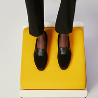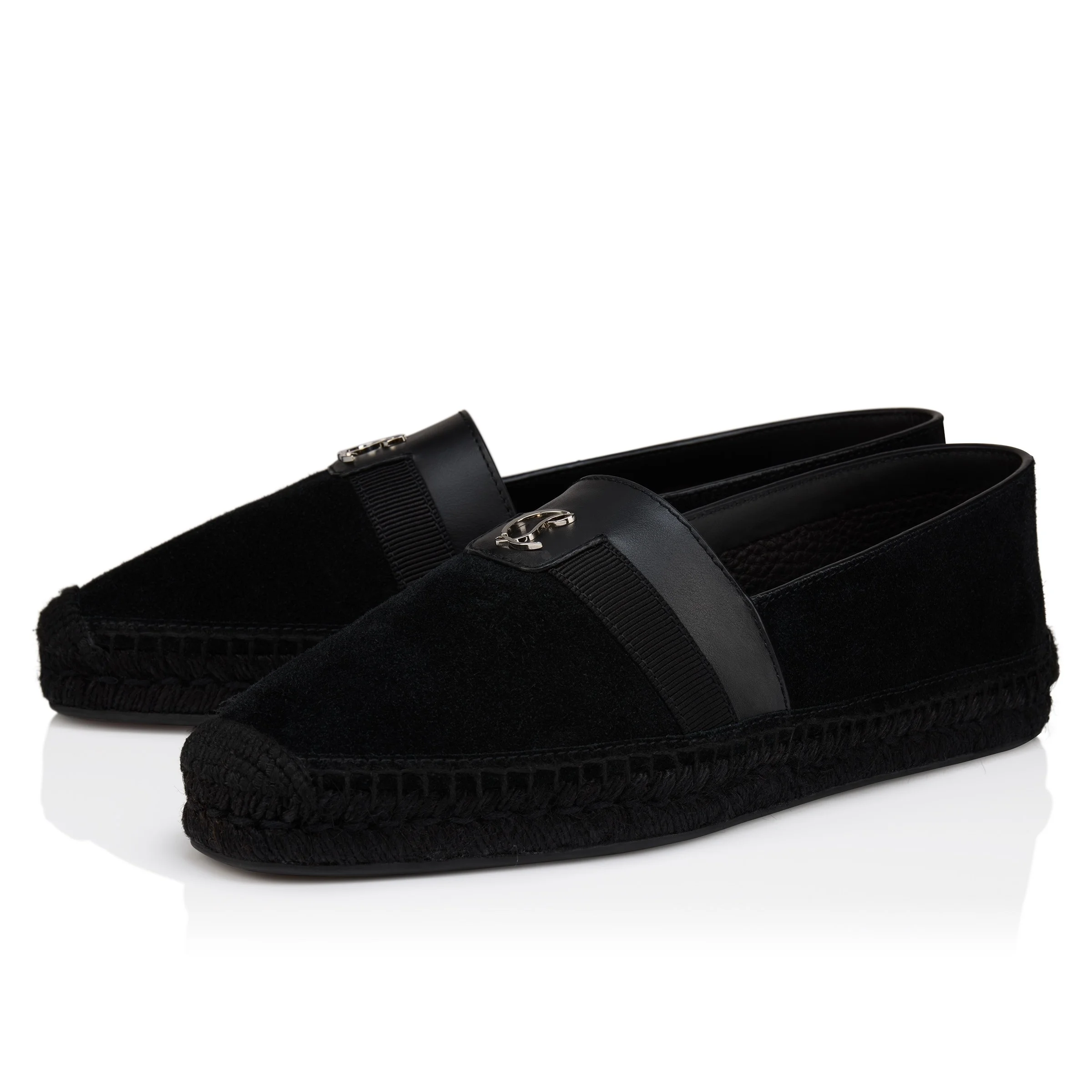 The Alfarica by Maison Christian Louboutin is as summery as it is urban and is set on a braided espadrille sole. This shoe has a tapered toe and a smooth tone-on-tone calf leather band trimmed with the iconic CL monogram. It's crafted from reversed black nubuck leather and features a supple construction. Product information Reference: 3250239BK01 Color: Black Material: Reversed nubuck leather