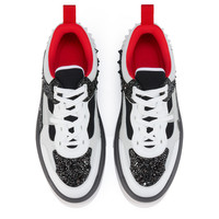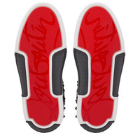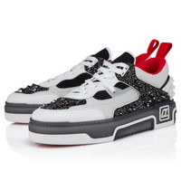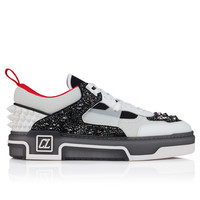 Inspired by the world of 90s basketball, the Astroloubi Strass Eternity sneaker sits on a rubber sole. This black and white model is adorned with strass and blends suede, leather Comete strass and rubber. It features a CL monogram on the side, an iconic Loubi red heel tab and tonal signature Maison Christian Louboutin spikes on the heel. Product information Reference: 1250586WH51 Color: White Material: Calf leather, leather Comete and strass