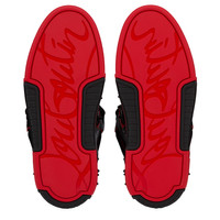 Showcasing an array of Maison Christian Louboutin signature details, the Astroloubi model is inspired by the aesthetic of skateboarders. This sophisticated shoe combines calf leather, mesh and pearlescent patent leather. Sporty and lightweight, this black and Loubi red model also features an oversized tongue and a loop at the back. It features spikes and a Varsity CL logo on the side. Product information Reference: 3250584H358 Color: Black Material: Calf leather, fabric and pearlescent patent leather