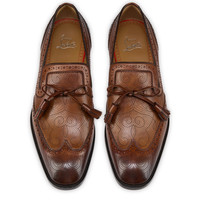 The urban Grave Moc features a sophisticated perforated pattern that showcases a bold style. This slender Maison Christian Louboutin shoe is crafted from a patinated Havane brown calf leather and has a slightly square toe. Each perforation has been carefully coloured using a small precision brush. It has a square tongue and a knotted tassel. This model features an 'Everlasting Red' sole thanks to an innovative coating technique to ensure resistance and lasting vibrancy for our signature Louboutin red. Product information Reference: 3250054BWI3 Color: Havane Material: Patinated calf leather
