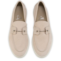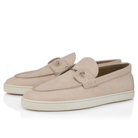 The Chambeliboat boat shoe is characterized by its sleek silhouette. It has a refined design with a tone-on-tone lining, a white rubber sole and is crafted entirely from beige unlined nubuck grained leather. It is adorned with a metallic collar pin on the vamp, showcasing Maison Christian Louboutin's creative flair. This model has a more supple construction. Product information Reference: 1260680BG72 Color: Beige Material: Grained calf leather