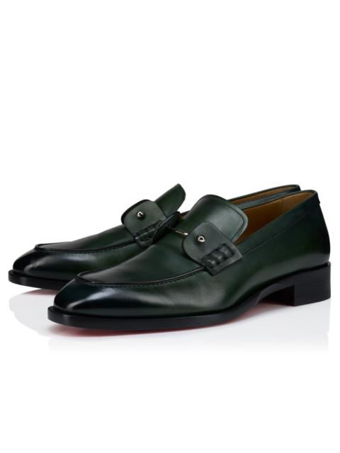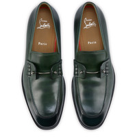 The Chambelimoc is an elegant blend of dress shoe and loafer with a sleek design and rounded toe. It is crafted in patinated Tropical green calf leather and features raw edge trims. The vamp is adorned with a removable silver collar pin in Maison Christian Louboutin's bold, edgy style. Product information Reference: 3240877E747 Color: Tropical Material: Patinated calf leather