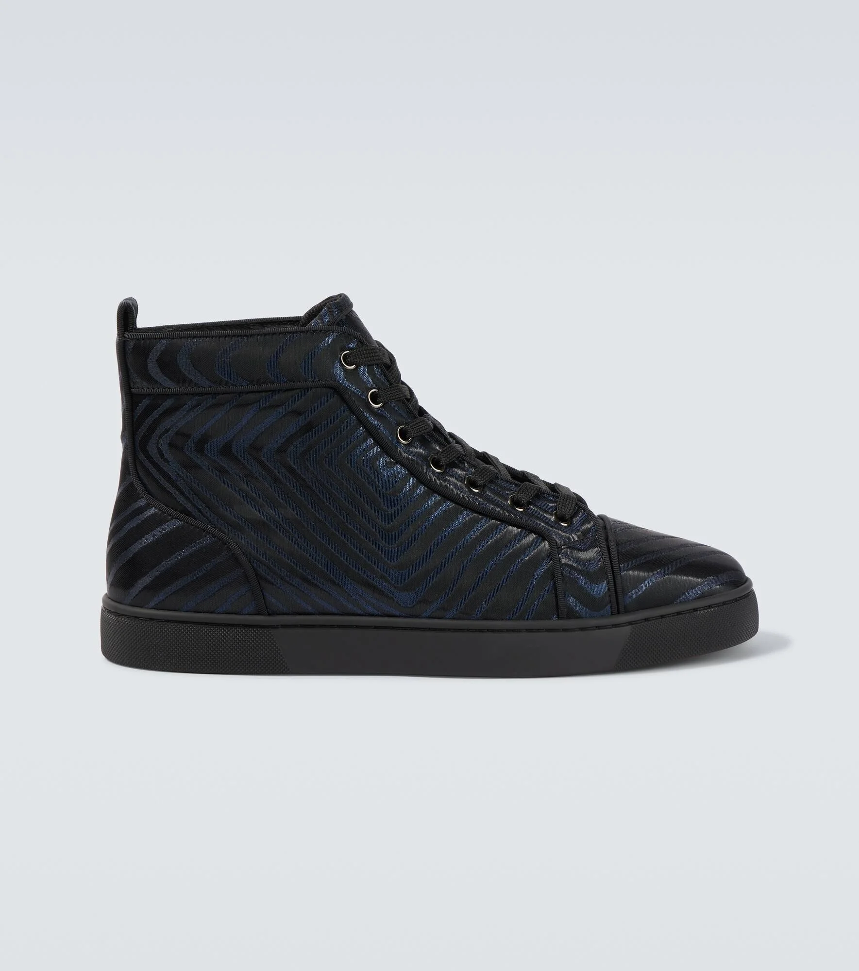 Crafted in Italy using jacquard, the Louis high-top sneakers from Christian Louboutin feature leather insoles on almond-toe silhouettes. This design is finished with stripes all over and the brand's signature red soles. Product Details - Upper: fabric - Lining: fabric, leather - Sole: leather insole, signature red rubber sole - Toe shape: almond toe - Made in Italy - Includes: shoe box, dust bags, extra laces - Designer color name: Black-Navy - Item color: black - Closure: lace-up - Item number: P01050860 Size & Fit - True to size - European sizes