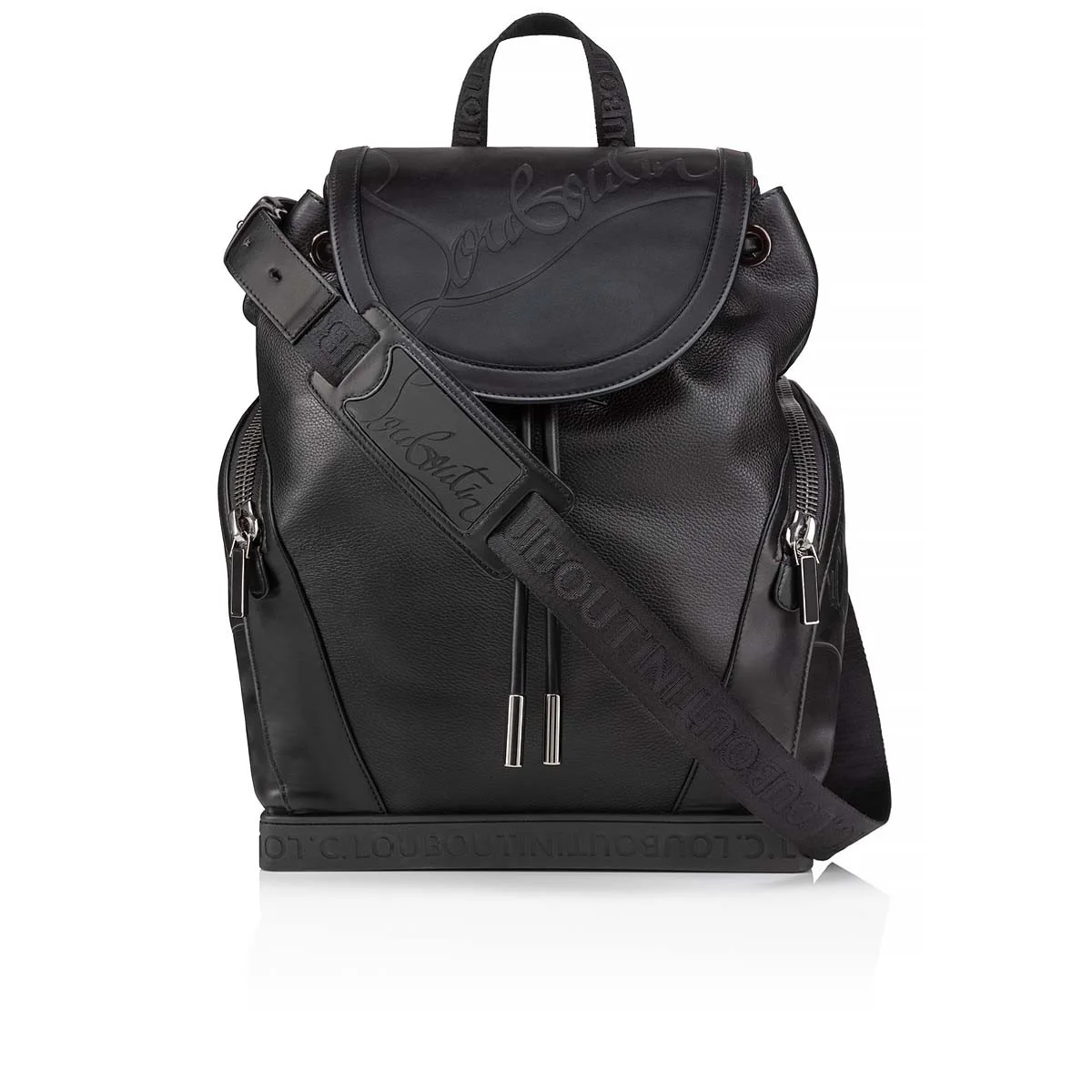 The urban Explorafunk backpack bears a Maison Christian Louboutin signature. With its sporty lines, it combines rubber and smooth and textured black calf leather. - One 2.4 inch/6 cm handle and two 28.3 to 33 inch/72 to 84 cm straps - A single long strap allows it to be carried by hand, over the shoulder or crossbody - Magnetic fastening - 1 interior zipped pocket - 2 outer zipped pockets - Dimensions: - H 10.2 x L 8.2 x W 3.9 inches - H 26 x L 21 x W 10 cm Product information Material: Calf leather Color: Black Reference: 1245209B260 Dimensions: 17.3 x 13.8 x 6.3 inches Collection: Summer 24