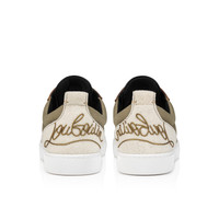 Taking its cue from 1980s tennis shoes, the Fun Louis Junior low-top sneaker features timeless lines and an elegant appearance. It showcases Maison Christian Louboutin’s creativity with a playful mix of colors and fabrics. This model combines black textured leather on the toe, smooth leather eyestays, canvas quarters and a cream felt heel counter bearing a "Louboutin" signature. Meticulous topstitching adds a couture finish. Product information Material: Calf leather Color: Multicolor Reference: 1240651CMA3 Collection: Summer 24