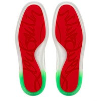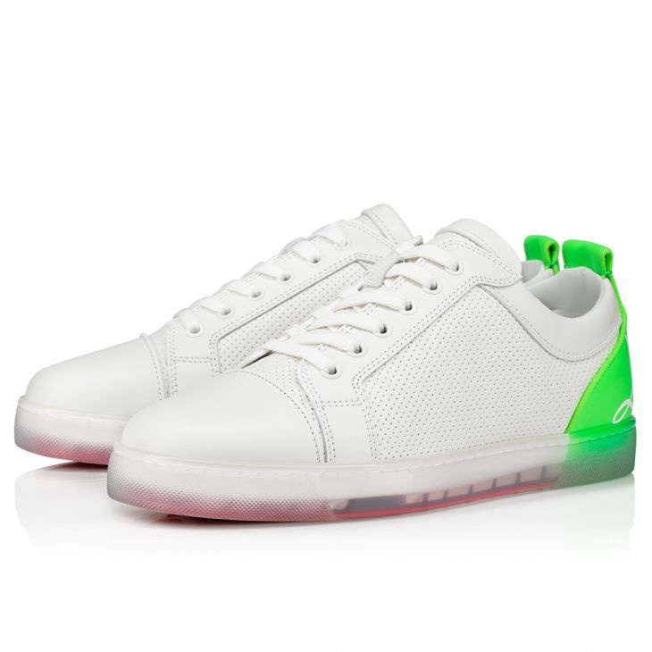 Taking its cue from the timeless low-top, the Fun Louis Junior deftly combines retro style with contemporary design elements. The upper is crafted from calf leather in brilliant Bianco white with a perforated finish. For a striking effect, the heel counter comes in fluo green with a white Louboutin signature logo, embellished with a grosgrain trim. For that inimitable touch of Maison Christian Louboutin flair, this version has a clear creeper sole. Product information Material: Calf leather Color: Green Reference: 1231146T967 Collection: Summer 23