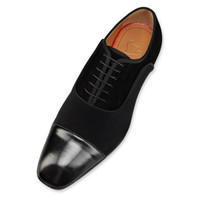 The Greggo city shoe has a timeless, slender design and combines a variety of textures. It brings together calf patine leather and Shell black fabric. It is outlined with a tonal grosgrain ribbon trim, showcasing Maison Christian Louboutin's expertise. This model features a tapered toe and lacing on the upper enhancing its sophisticated, urban appeal. Product information Material: Calf leather Color: Black Reference: 1230916BK01 Collection: Summer 23