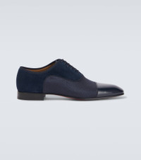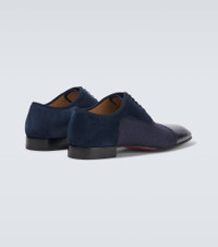 The Greggo Oxford shoes from Christian Louboutin are crafted from blue leather, veau velours, and textured fabric. They feature tonal grosgrain ribbon trims, elongated toes, and the brand's signature red-lacquered soles. Product Details - Upper: leather - Lining: leather - Sole: leather insole, signature red leather sole - Toe shape: almond toe - Made in Italy - Includes: shoe box, dust bags, extra laces - Designer color name: Marine - Closure: lace-up - Trim: fabric - Item number: P01008387 Size & Fit - True to size - European sizes