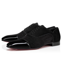 With its sleek lines, the Greggy Chick Oxford shoe features V-shaped notches below the ankle, an example of Maison Christian Louboutin's creativity. It combines black patent calf leather with Velvet Ball embossed veau velours. This urban model is enhanced with discreet lacing and a tonal grosgrain ribbon trim. Product information Material: Velvet Color: Black Reference: 3230782BK01 Collection: Fall Winter 23