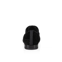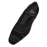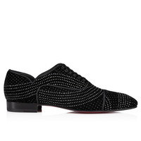 Modeled on the iconic Greggo Oxford shoe, the Greggy Chick is a dress shoe with attitude. It features a slender outsole, an elongated toe and the daring scalloped edges of Maison Christian Louboutin's Hot Chick stiletto. It is crafted in Velvet River fabric with a black background and swirling tiny silver dots. The sections of the shoe are outlined with a grosgrain ribbon trim. Product information Material: Velvet Color: Black Reference: 3230240BK65 Collection: Fall Winter 23
