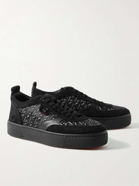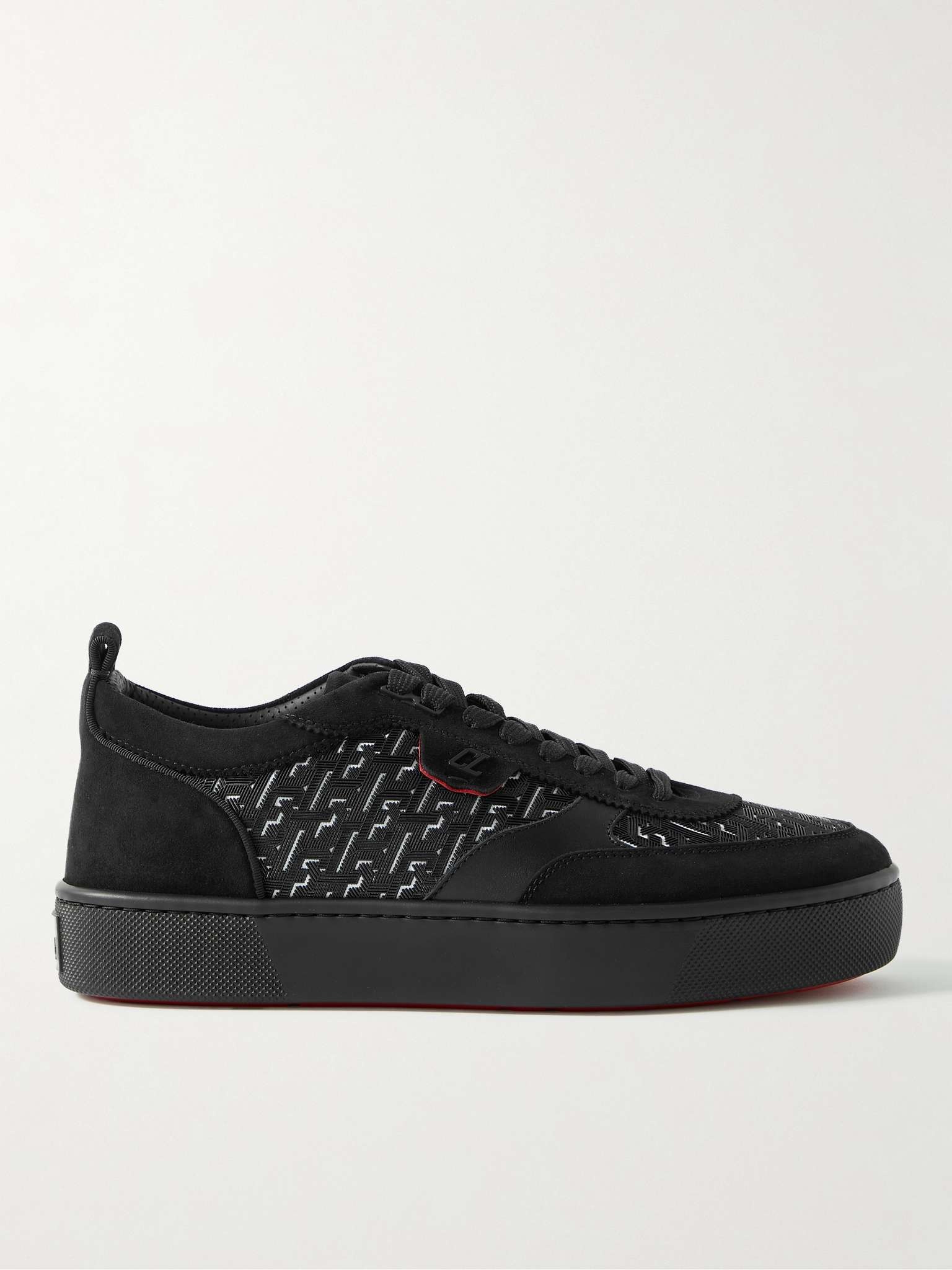 The sleek, all-black design of Christian Louboutin's 'Happyrui' sneakers means they'll match just about anything. They're made from leather-trimmed suede and set on thick rubber soles rendered in signature red at the bottom. Look closely and you'll spot rubberised 'CL' monograms. Size & Fit - Fits true to size. Take your normal size - European sizing Details & Care - Black rubber, suede and leather (Calf) - Lace-up - Come with a dust bag and spare laces - Style number: 1210650