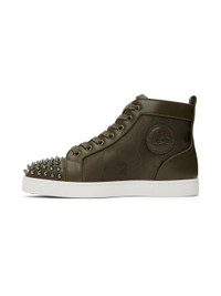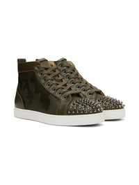 High-top paneled canvas and buffed leather sneakers in brown. · Stud accents at round toe · Lace-up closure · Padded tongue and collar · Leather pull-loop at heel collar · Buffed leather lining · Textured rubber midsole · Treaded signature red rubber outsole Supplier color: Balmore Upper: textile, leather. Sole: rubber.