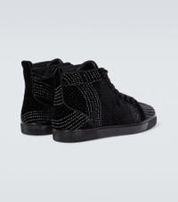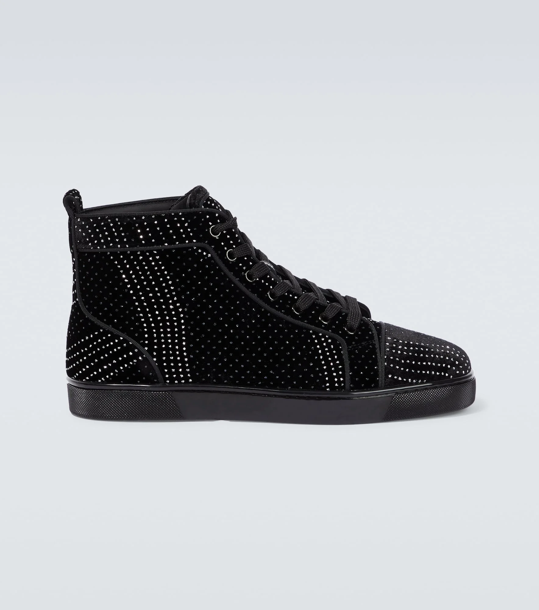 These high-top sneakers from Christian Louboutin are made from plush embellished suede. The design is inspired by '80s styles and has punchy logo patches at the sides and rests atop signature red soles. Product Details - Lining: leather - Sole: leather insole, rubber sole - Toe shape: round toe - Comes with extra laces - Closure: lace-up - Designer color name: Black/Silver - Made in Italy - Comes with dust bags - Upper: fabric - Comes with a box - Item number: P00808144 Size & Fit - True to size - Half sizes please take the next size up - European sizes
