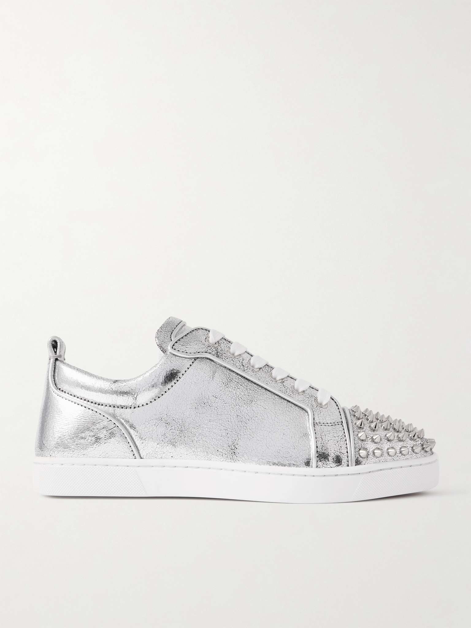 Christian Louboutin’s 'Louis Junior Spikes' sneakers are instantly recognizable thanks to their studded cap toes. They’re made from metallic cracked-leather and have signature red soles. Size & Fit - Fits true to size. Take your normal size - European sizing Details & Care - Silver cracked-leather (Calf) - Lace-up - Style number: 1250206