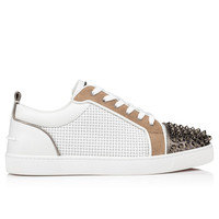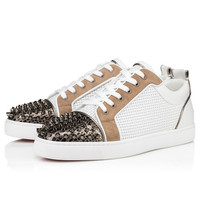 The Louis Junior Spikes sneaker is an iconic Maison Christian Louboutin low-top sneaker modeled on the 1980s tennis shoe. A timeless sneaker showcasing meticulous craftsmanship and elegant finishing details, dressed in an array of textures each season. This model combines white calf gaufre woven leather quarters outlined in brown with a metallic, reptile effect toe adorned with signature metal spikes. Product information Material: Calf leather Color: Multicolor Reference: 3230199CMA3 Collection: Fall Winter 23