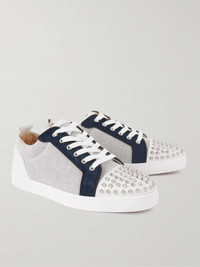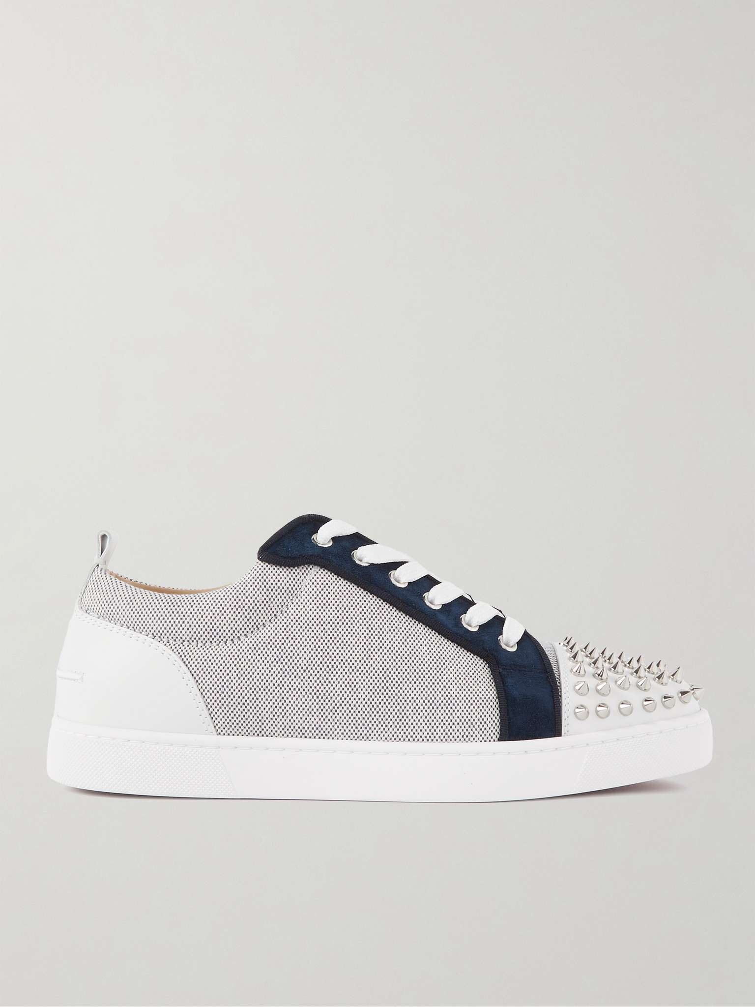 Christian Louboutin's 'Louis Junior' sneakers take cues from basketball shoes, though the signature spikes feel far more street than court-appropriate. They're made from canvas, trimmed with leather for contrast and set on the signature branded red soles. Size & Fit - Fits true to size. Take your normal size - European sizing Details & Care - Grey canvas, black and white leather (Calf) - Lace-up - Style number: 1230925