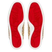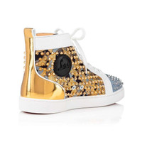 An iconic model from the Maison Christian Louboutin, the Louis Orlato is inspired by the timeless 1980s basketball shoe. This season's iteration of the high-top sneaker comes in a multi version, featuring sumptuous Jacquard Nirvana fabric with white mesh quarters, complemented with a gold metallic heel counter. Signature spikes adorn the toe box, for an edgy punk attitude. PRODUCT INFORMATION Reference: 3220164CMA3 Color: MULTICOLOR Material: Nylon Collection: Fall Winter 22