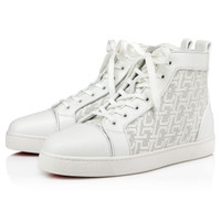 The Louis Orlato is an iconic high-top sneaker inspired by timeless 1980s basketball shoes. A regular style in Maison Christian Louboutin’s collections, the Louis Orlato showcases a signature blend of fabrics for an audacious effect. This model, in all-over Bianco white, features CL monogrammed leather on the quarters, and smooth nappa leather on the toe, heel, and eyelets. Exquisite tonal grosgrain piping creates a sophisticated finish. PRODUCT INFORMATION Reference: 1230181W222 Color: WHITE Material: Calf leather Collection: Summer 23