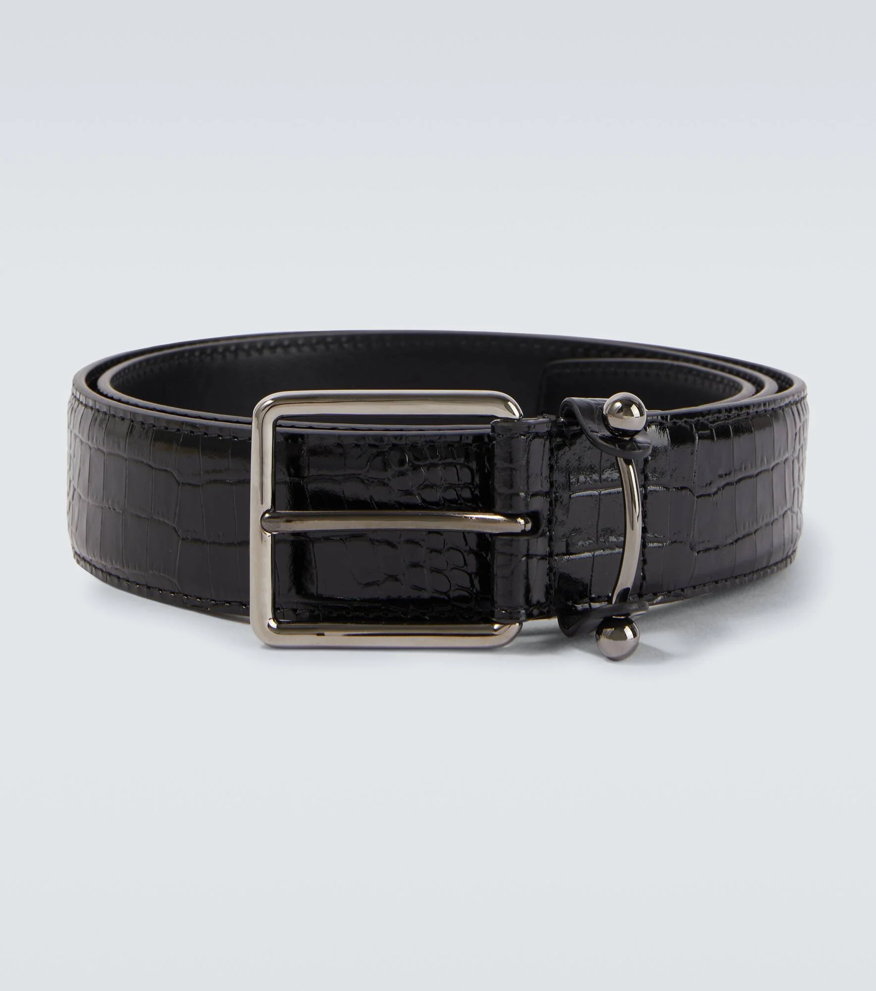 Elevate your looks with this bold Christian Louboutin belt. The piece is made in Italy from croc-effect calfskin leather and has a square buckle. Product Details - Material: calf leather - Lining: calf leather - Made in Italy - Designer color name: Black/Gun Metal - Item color: black - Hardware color: silver - Includes: dust bag, box - Item number: P01067701 Size & Fit - Width 3.5cm-1.5" - Buckle width 4.5cm-2"