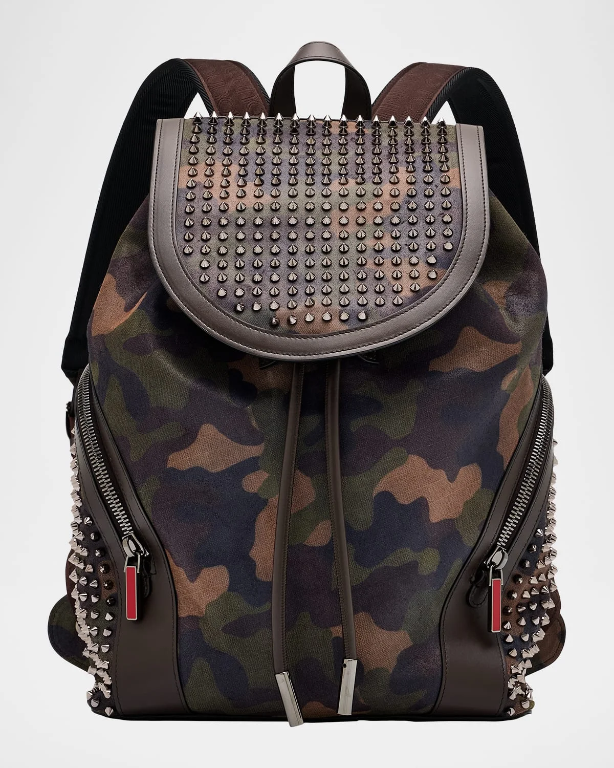 - Christian Louboutin "Funky" backpack in camouflage-printed nubuck leather, showcasing signature metallic gunmetal spikes on the sides and top - One top handle; 3.5" drop - Two adjustable shoulder straps - Magnetic snap - Flap top with drawstring fastening - Exterior, two zip pockets - Interior, one main compartment, one laptop pocket - Signature Loubi red lining - Lasered signature on the bottom base - Approx. 17.5"H x 14"W x 6.5"D - Made in Italy
