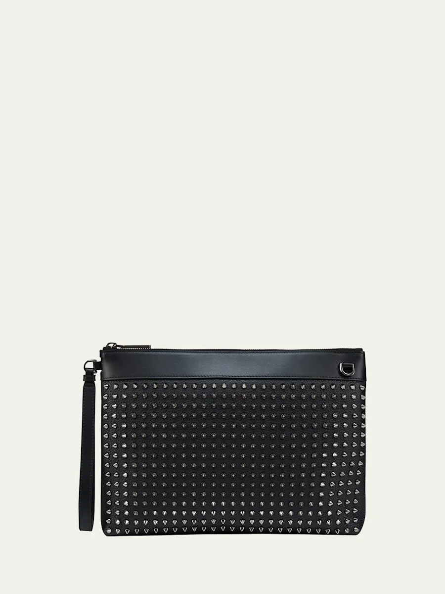 Christian Louboutin "Funky" pouch in suede and leather Features signature spikes Leather wrist strap Exterior, back zip pocket Signature red cotton lining Zip closure Approx. 9.1"W x 1.8"D Made in Italy