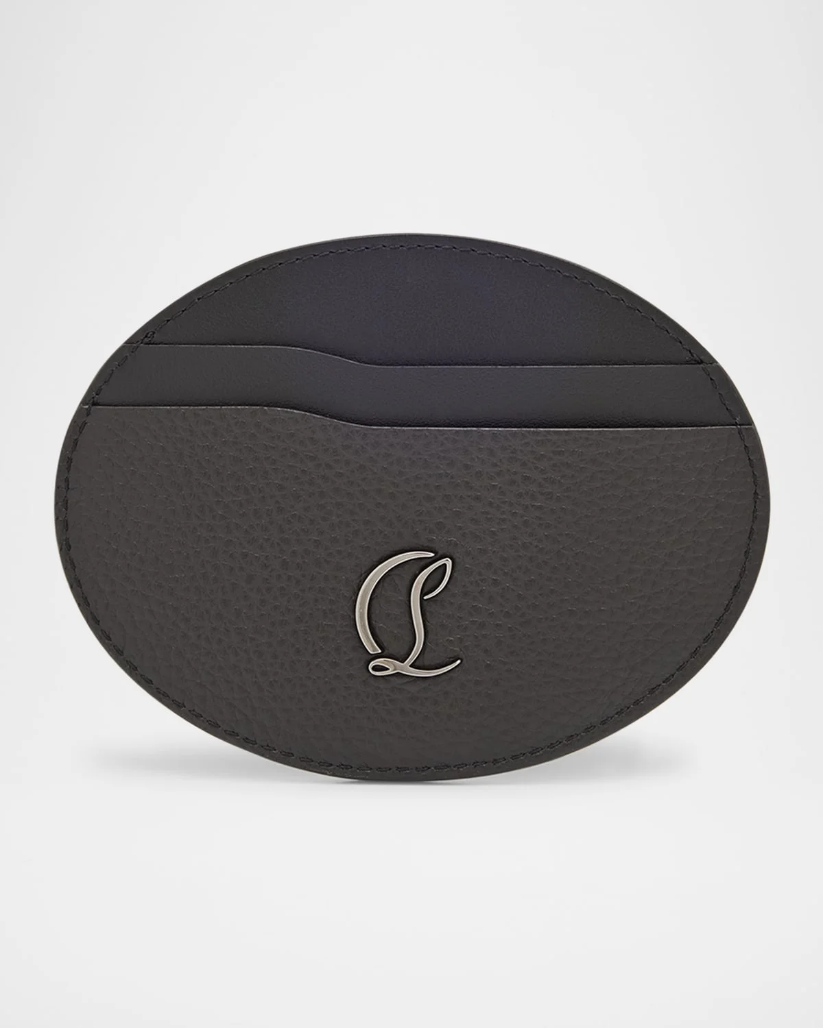 - Christian Louboutin oval-shaped card holder in smooth and grained calf leather - Mooncrest monogram on the front - Embossed signature on the back - Signature Loubi red interior - Four card slots - One central compartment - Approx. 3.5"H x 4.7"W x 0.2"D - Made in Italy
