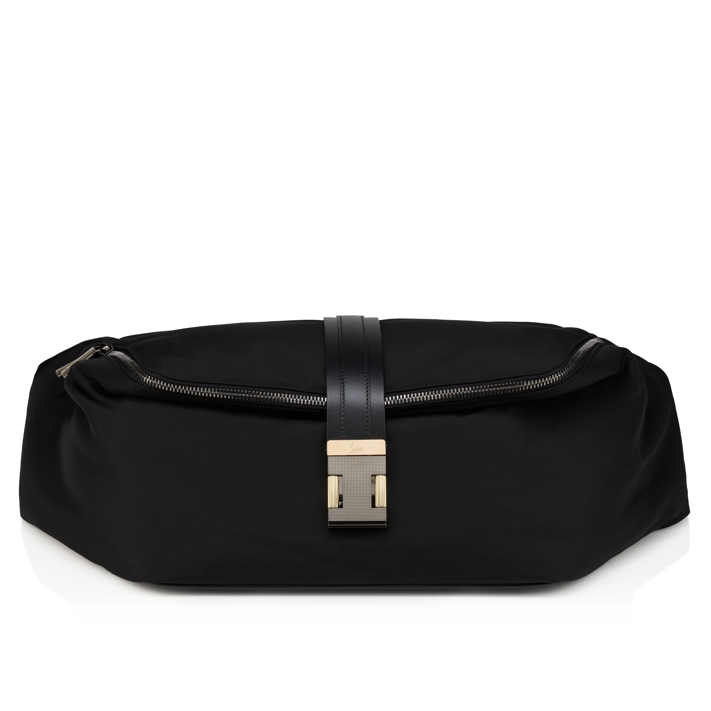 The Nox Bumbag in size large is an eye-catching crossbody bag characterized by its crafted clasp with a guilloche finish. With its generous size and bold design, this bag redefines the codes of men's style and is the ideal accessory for a modern masculine silhouette with a confident urban look. This elegant accessory works as both a crossbody and a bumbag and is made entirely from black nylon. - 1 adjustable webbing strap, so it can be worn over the shoulder or around the waist - Main compartment with zipped closure with an internal zipped pocket - 1 second zipped compartment with zipped closure on the back - 1 open compartment on the back - Dimensions: - H 7 x L 15 x W 5 inches - H 18 x L 38 x W 13 cm Product information Reference: 1265100BK01 Color: Black Material: Nylon Dimensions: 180mm x 380mm x 130mm