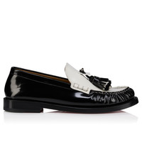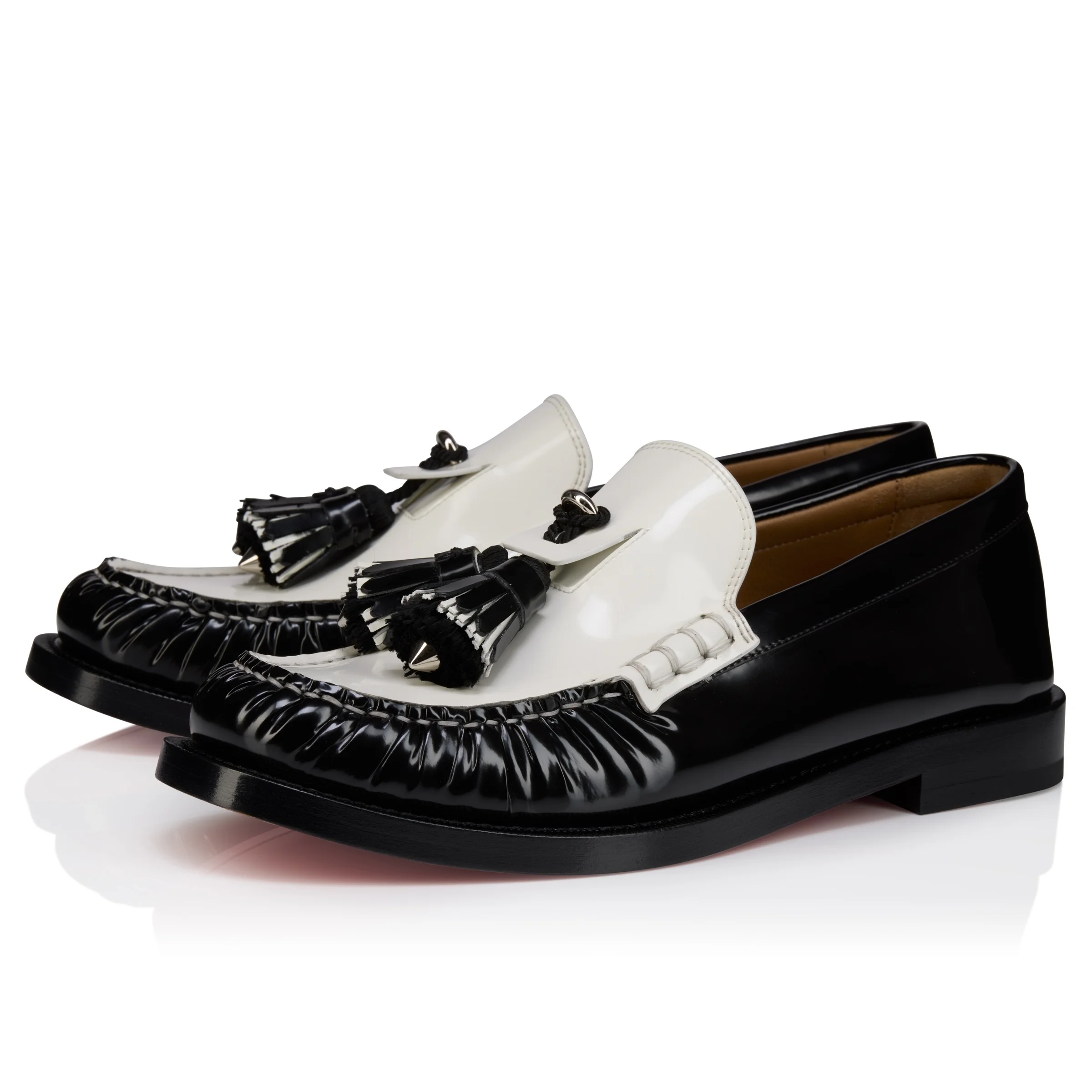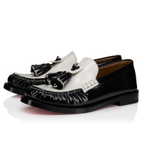 The timeless Orlando loafer is partially hand-stitched and adorned with two distinctive leather and textile tassels, each decorated with a spike. Crafted in black and Bianco white slightly shiny calf leather, this model features the iconic Loubi red sole, the embodiment of Maison Christian Louboutin sophistication. Product information Reference: 1260628Q003 Color: Black Material: Abrasivato calf leather