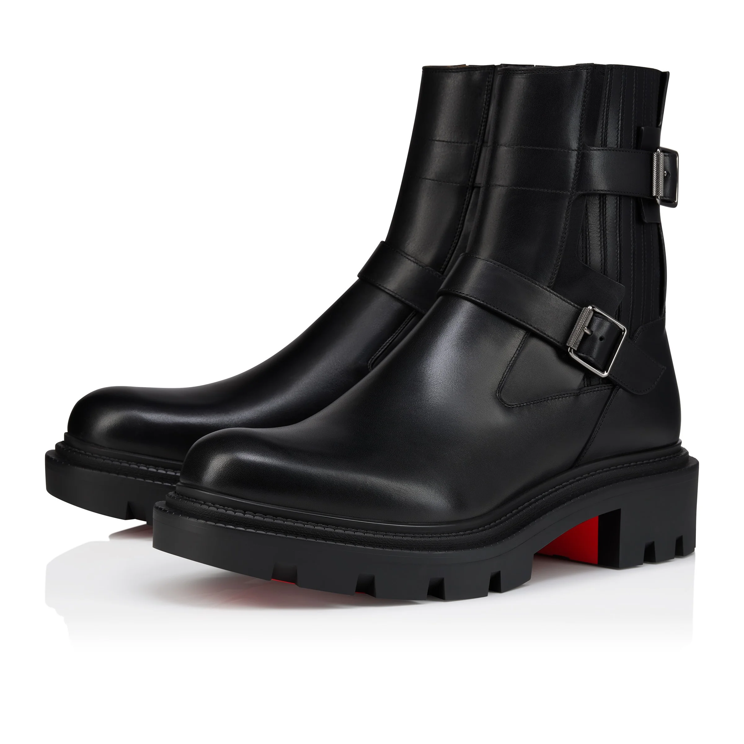 The Oxyboot College is an urban shoe with a notched sole. Distinguished by its rounded toe, it is made entirely from black light-reflecting brushed calf leather. A testament to the expertise of Maison Christian Louboutin, it features a leather side panel and two functional straps with metallic buckles. Product information Reference: 3250526BK01 Color: Black Material: Calf leather