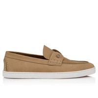 The Chambeliboat boat shoe has a sleek silhouette. An elegant design with a supple construction crafted from unlined Lionne beige nubuck leather. This shoe's tongue is trimmed with a metal collar pin, showcasing Maison Christian Louboutin's creative flair. A light, summery and urban model set on a white rubber sole. Product information Reference: 3240186F760 Color: Lionne Material: Reversed nubuck leather