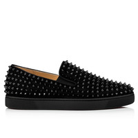 Drawing inspiration from the classic boat shoe, the Roller-Boat has become an iconic sneaker model. This low-top in all-over black features a one-piece construction crafted from the Maison Christian Louboutin’s proprietary veau velours suede. The entire upper is adorned with matte tonal spikes in a nod to Christian Louboutin’s punk roots, while a tone-on-tone grosgrain trim, stretch panel and creeper sole ground the overall effect. Product information Material: Veau velours Color: Black Reference: 1120387B049 Collection: Summer 12