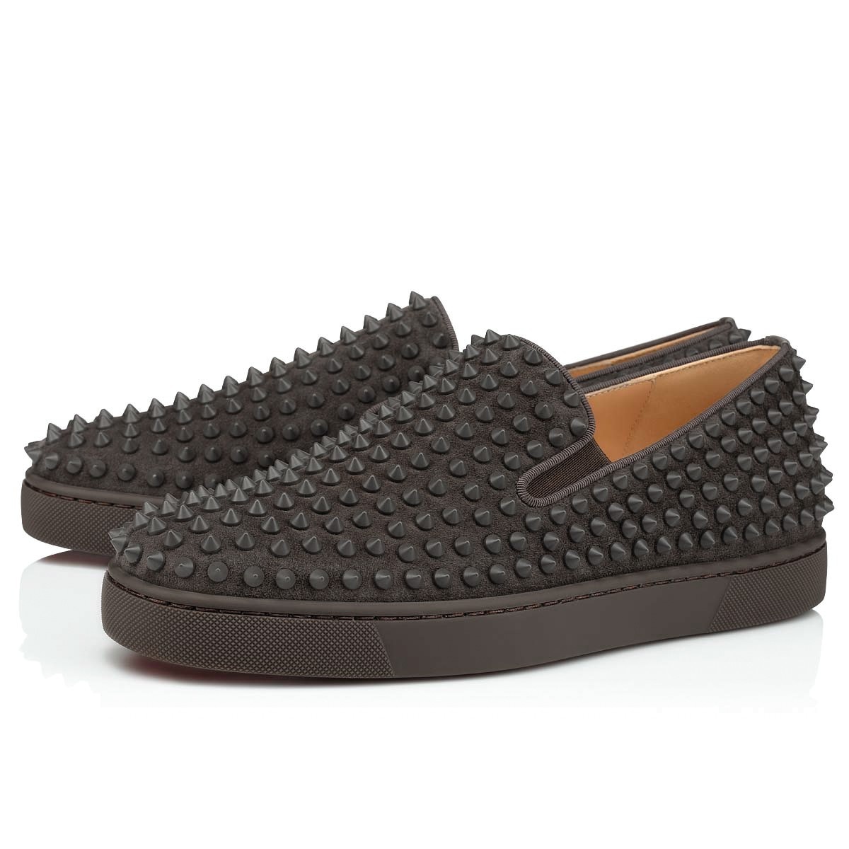 The Roller-Boat moccasin draws its inspiration from the world of skateboarding. This shoe sits on a brown rubber sole and is dressed in Ombre grey suede calfskin for a harmonious style. It is covered with Maison Christian Louboutin tone-on-tone matte spikes. Elastic bands on the sides and matching grosgrain trims give it great elegance.