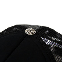 This Chrome Hearts Cemetery Trucker Hat reflects the brand's Gothic inspirations. The accessory is decorated with white embroidered crosses that stand out against the black colorway. The silver-tone hardware on the top is a brand signature.
