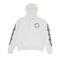 This white Chrome Hearts hoodie features the Los Angeles brand's signature horseshoe motif on the chest and back. The sleeves are printed with floral iconography in the same aesthetic.