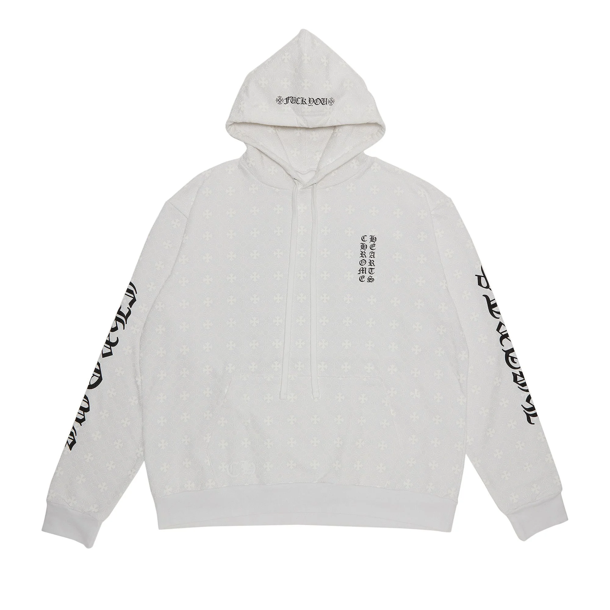 This Chrome Hearts hoodie features tonal motifs throughout. The pullover is finished in white with black logo detailing.