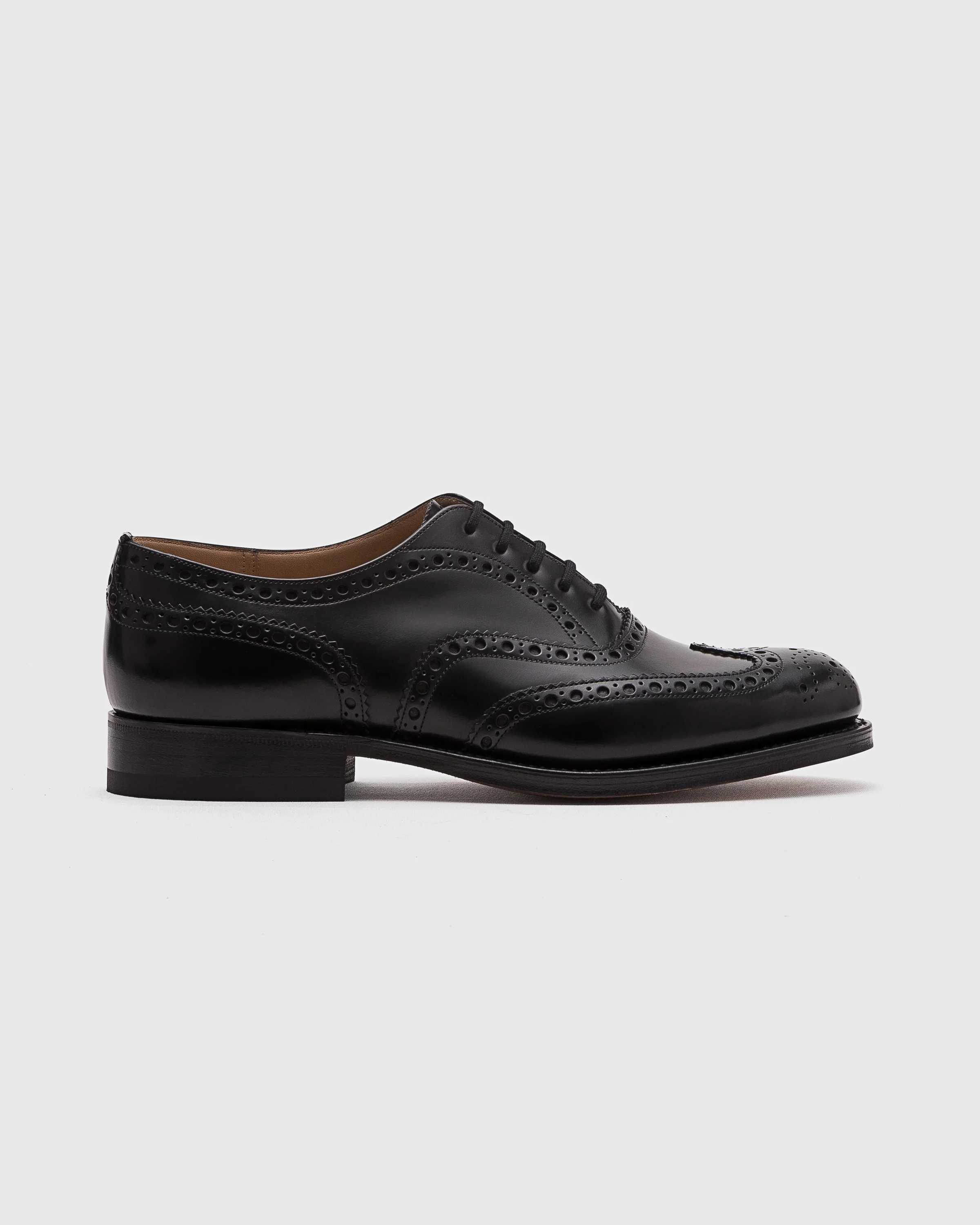 A classic full brogue oxford with exceptional durability, introduced in 1970 the Burwood was historically constructed using untanned hide whose perforations allowed water to drain from the shoes when the wearer crossed wet terrains. A favourite among those who prefer a sturdier shoe without compromising on elegance, the Burwood contrasts decorative brogueing and a high-shine finish with a highly practical double sole, perfect for repelling water and offering longevity of wear. ------Made in Northampton, England. • Product code: EEB002_9XV_F0AAB_F_000000 • Full brogue lace-up oxford--- • Calf leather with polished binder finish--- • Cotton laces--- • Blind eyelets--- • Last 81--- • Leather double-sole with rubber heel--- • Internal lining for longevity of wear--- • Handwritten shoe info to lining--- • Goodyear construction--- • Church’s crest to sock • Imported product