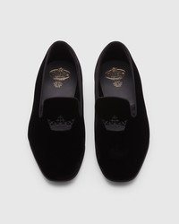 The Sovereign 2 loafer captures all the regal sophistication of the historical slippers it’s inspired by. Worn by nobility in the 1800’s, these ornate items were crafted in sumptuous velvet to match equally ostentatious loungewear. Reinterpreted as a fashion item with luxurious leanings, it features a ‘King John Crown’ crest embroidered onto the upper, echoing the shoe's English heritage. Finished with a grosgrain edge and lined in quilted silk for comfort. A short block heel adds a sense of formality, making it appropriate for evening events.------Made in Northampton, England. • Product code: ES0042_9WQ_F0AAB_F_000000 • Loafer with black crown embroidery to vamp--- • Velvet upper--- • Grosgrain topline--- • Last 54--- • Leather sole--- • Quilted silk lining--- • Church’s crest to sock and sole--- • We advise to purchase a half size bigger than your usual size • Imported product