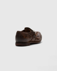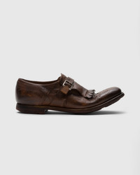 An unmistakable icon, the buckled Shanghai has been reincarnated many times yet continues to channel Church’s heritage. Every detail is an artisanal triumph - from the traditional brogue perforations and sharp tassels to its aged, vintage effects. Reworked in glace calf leather, it embraces its original materials, spiking them with modern flair. These rich textures deserve to be worn with a fine suit, however, their distressed finish makes a great match for more casual accompaniments. Taking an average of 200 steps to complete, each Shanghai shoe is as unique as it is desirable. A robust Church & Co rubber sole ensures longevity and offers traction for comfortable walks around the city. • Product code: EOG001_9PW_F0AAR_F_000000 • Loafer with side buckle • Glace calf with broguing • Silver-tone buckle and fringe detail • Raised toe spring • Vintage rubber sole with rivets • Internal lining for comfort and longevity of wear • Vintage Church's label to lining • Church's crest to distressed sock • Vintage logo to sole • Imported product