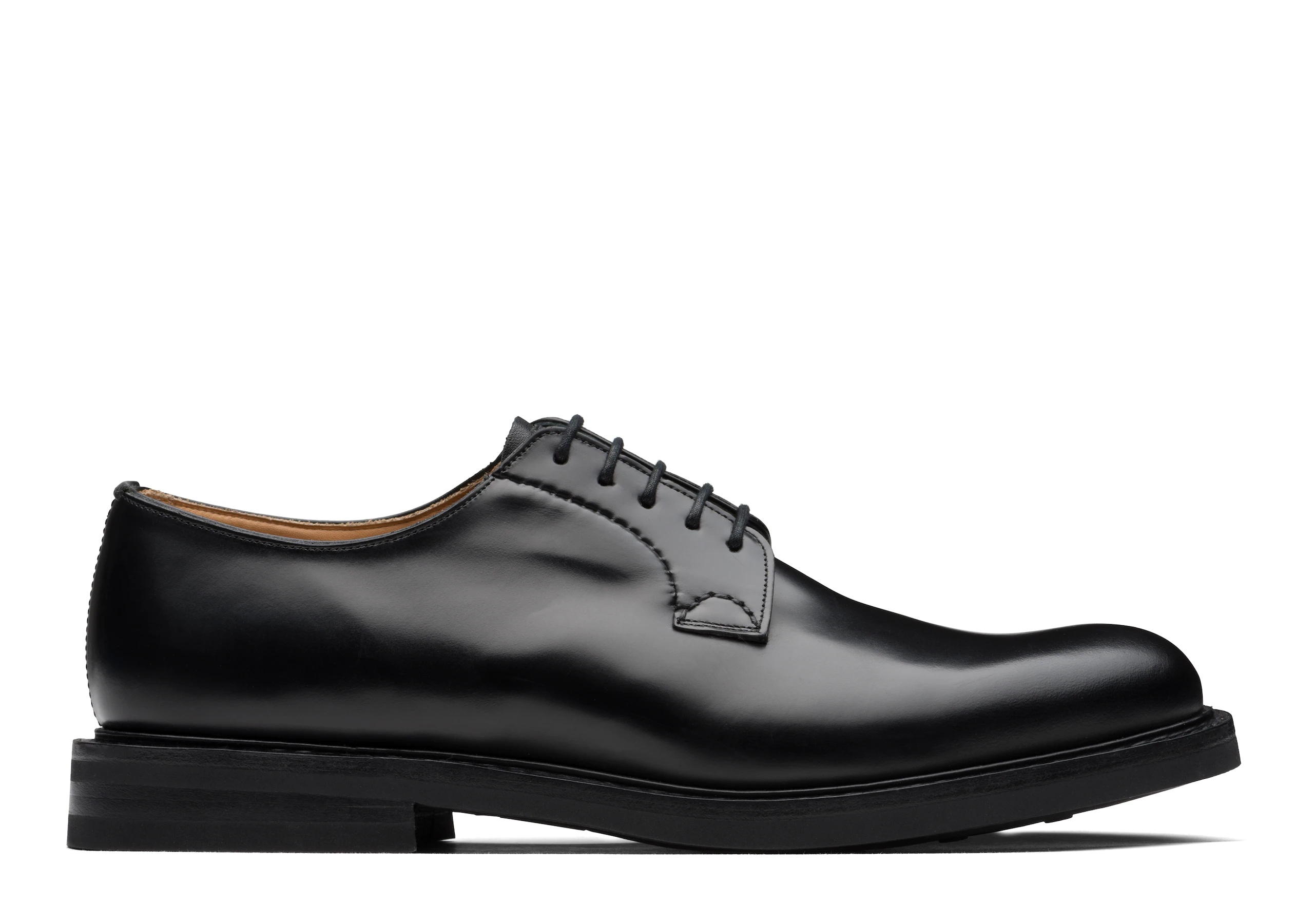 product details • Plain lace-up derby blucher with hand stitching to eyestay • Whole cut leather with polished binder finish • Half moon stitching detail to eyestay • Nappa bellow tongue • Leather laces • Blind eyelets • Last 103 • Leather double-sole • Internal lining for longevity of wear • Handwritten shoe info to lining • Goodyear construction with storm welt • Church’s crest to sock and sole