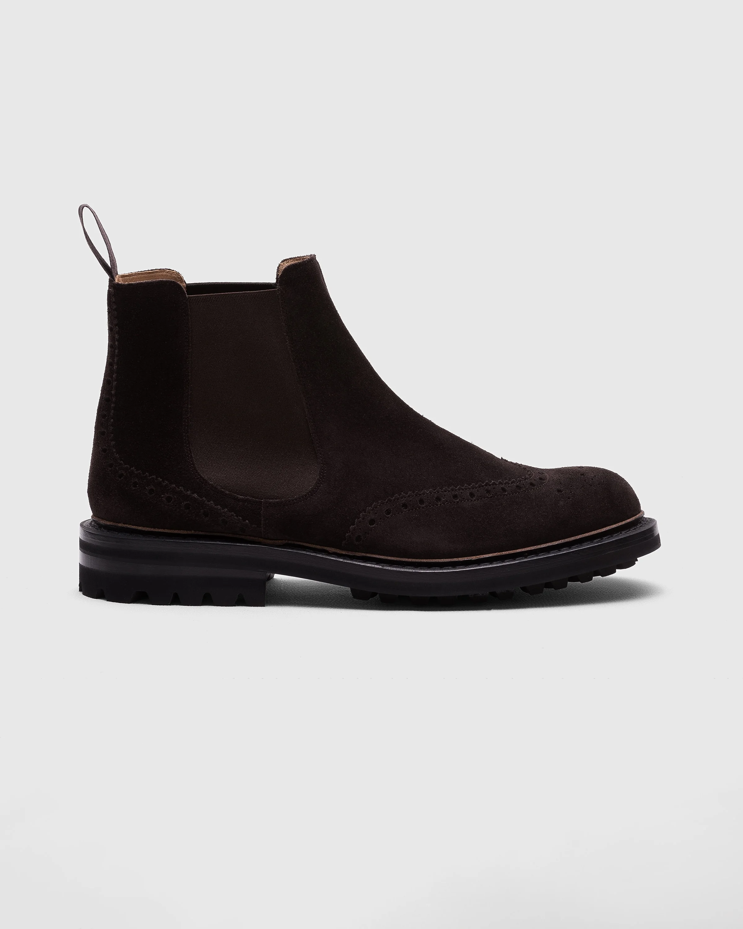 An intricate full brogue motif adds an elegant note to the McEntyre LW design, a classic Chelsea boot featuring functional and sporty details. The soft suede upper emphasises its refined yet casual charm, making it an ideal choice for leisure and professional settings, while the elasticated inserts, cotton pull-tab, and lightweight sole recall its equestrian origin. The internal lining and rugged sole with a storm welt guarantee grip, weather protection and durability. • Product code: ETC206_9VJ_F0AEV_F_000000 • Full brogue Chelsea boot with elasticated side insert • Suede leather • Back cotton pull-tab • Last 133 • Lightweight rubber sole • Internal lining for comfort and longevity of wear • Handwritten shoe info to lining • Goodyear construction with storm welt • Church's crest to sock and sole • Imported product