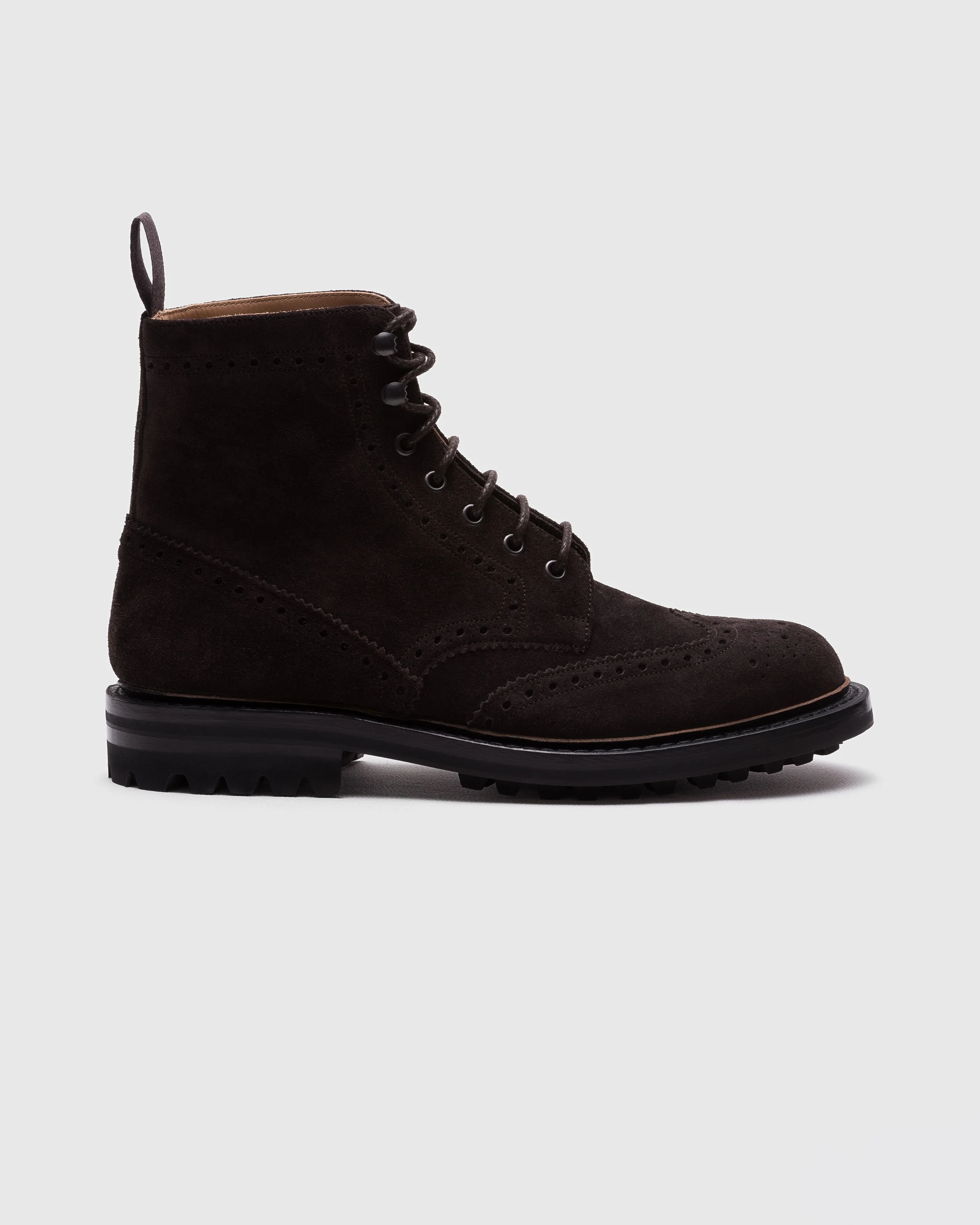 A lace-up Derby boot with a sturdy design and rural charm, embellished with a refined full-brogue motif, making it perfect for urban settings. Crafted from soft suede, the McFarlane LW style stands out for its versatility and functional details, such as the lightweight rubber sole, rear pull-tab and storm welt, guaranteeing an easy fit and water resistance. A true weekend essential. • Product code: ETC208_9VJ_F0AEV_F_000000 • Full brogue lace-up Derby boot • Suede leather • Back cotton pull-tab • Woven cotton laces • Metal eyelets and double speed eyelets to shaft • Last 133 • Lightweight Commando rubber sole • Internal lining for longevity of wear • Handwritten shoe info to lining Goodyear construction with storm welt • Imported product