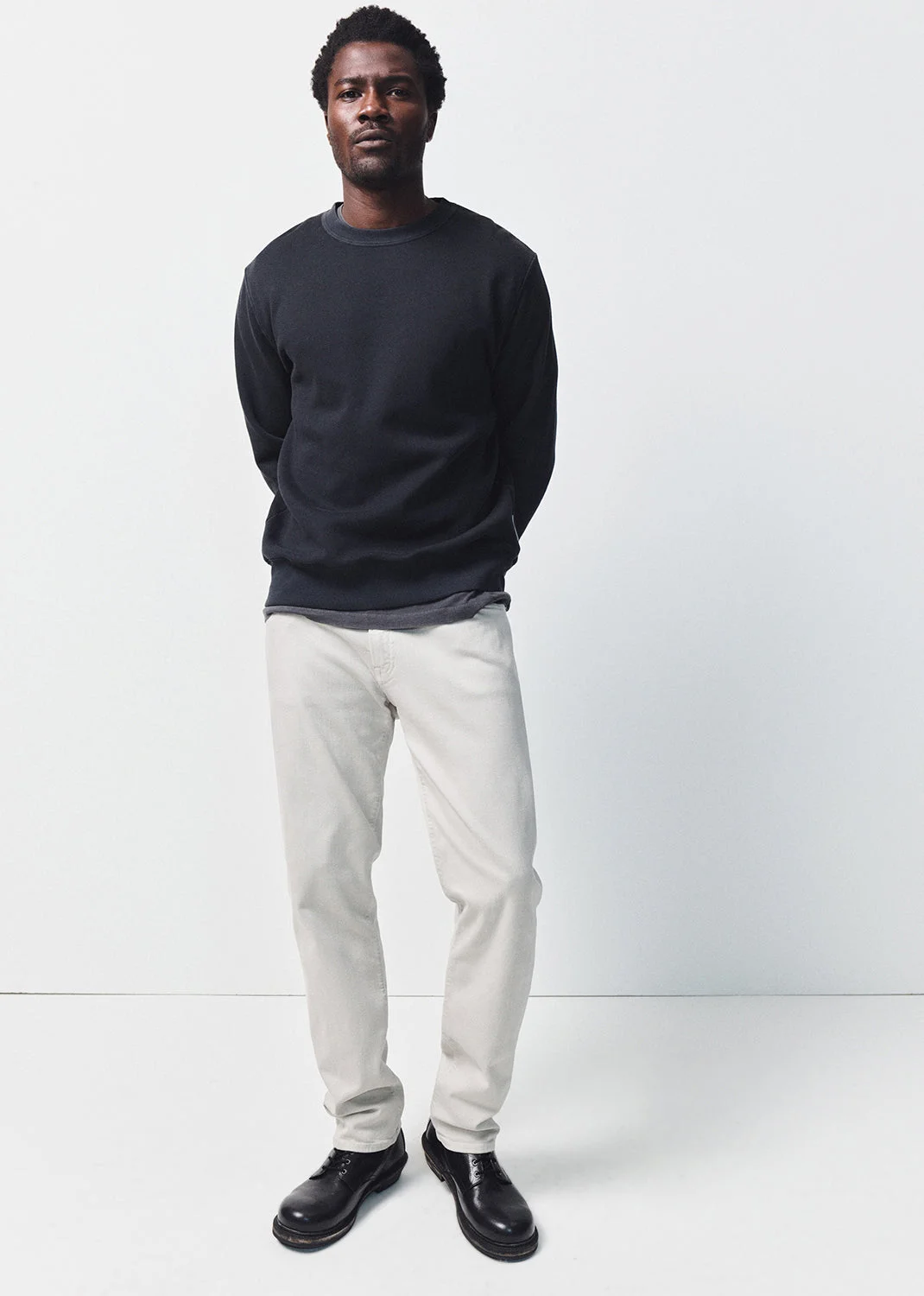 The Adler is our slim straight fit—slightly higher rise, room through the thigh, and a subtle taper from knee to ankle. This version is crafted from midweight French terry with added stretch for comfort and ease. Finished in a soft off-white with a subtle grey cast for a clean, modern look. This fit is true to size. Looks Like: Light off white pant with a subtle grey undertone Feels Like: Midweight french terry cotton made with plenty of stretch for all day comfort From our HUMANITY Collection DETAILS Closure: Zip Fly Rise: 10 1/2” Inseam: 32” Leg Opening: 14” Model is 6'1" and is wearing a Size 32 Fabric Content: 81% Cotton 10% Rayon 7% Lyocell 2% Spandex Care Instructions: Machine wash cold inside out with like colors. Do not bleach. Tumble dry low. Made in USA with imported materials 6390-1526_CVAS