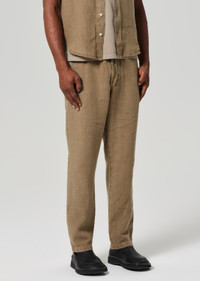 Designed with a drawstring waist and welt pockets, our deck pant is crafted from a luxurious linen blend. Noteworthy for its soft hand feel and beautiful wash, this sophisticated essential is perfect for the warmer months ahead. This fit is true to size. Looks Like: Dark khaki brown Feels Like: Midweight non-stretch linen DETAILS Closure: Button Fly Rise: 12 1/2” Inseam: 32” Leg Opening: 15 1/2” Model is 6'1" and is wearing a size 32 Fabric Content: 100% Linen Care Instructions: Machine wash cold inside out with like colors. Do not bleach. Tumble dry low. Made in USA with imported materials 7029-1777_RSOVI