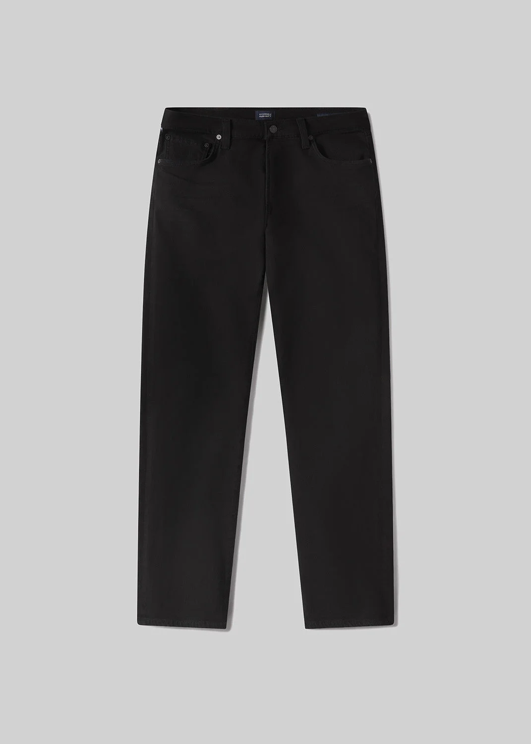 The Elijah is our most relaxed fit—cut straight through the hip and leg for a laid-back, easy feel. This pair is made from our signature Perform denim, blended with cashmere for exceptional softness and comfort. Finished in a clean, deep black wash for a sharp, elevated staple. If you loved our Sid or Perfect Casual Straight Fit, you will love the Elijah. This fit is true to size. Looks Like: Clean dark black denim Feels Like: Signature perform denim blended with cashmere for a super soft hand DETAILS Closure: Zip Fly Rise: 10 3/4” Inseam: 32” Leg Opening: 16” Model is 6'1" and is wearing a Size 31 Fabric Content: 93% Cotton 5.5% Cashmere 1.5% Elastane Care Instructions: Machine wash cold inside out with like colors. Do not bleach. Tumble dry low. Made in USA with imported materials 6510-1799-STRLS