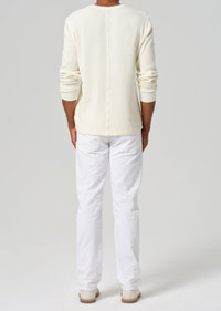 Our most relaxed fit, offering a straight fit throughout the hip and leg. If you loved our Sid or Perfect Casual Straight Fit, you will love the Elijah. This fit is true to size. Looks Like: Clean true white Feels Like: Midweight stretch linen From our HUMANITY Collection DETAILS Closure: Zip Fly Rise: 10 3/4” Inseam: 32” Leg Opening: 16 1/4” Model is 6'1" and is wearing a Size 31 Fabric Content: 67% Cotton 32% Linen 1% Elastane Care Instructions: Machine wash cold inside out with like colors. Do not bleach. Tumble dry low. Made in USA with imported materials 6510C-1762_WHT