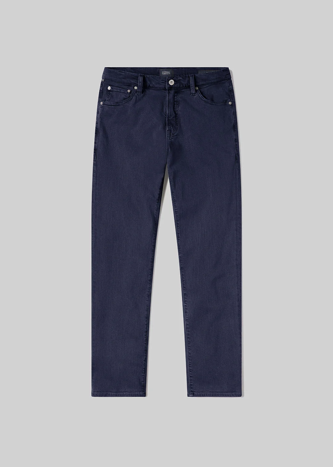 Our slim straight, relaxed through the thigh, with a gradual taper to the ankle, this is great for an athletic build. This fit is true to size. Looks Like: Deep dark blue Feels Like: Heavyweight yet breathable soft weft stretch twill From our HUMANITY Collection DETAILS Closure: Zip Fly Rise: 10 1/4” Inseam: 32 1/2” Leg Opening: 15” Model is 6'1" and is wearing a Size 32 Fabric Content: 43% Viscose 33% Cotton 17% Lyocell 5% Polyester 2% Elastane Care Instructions: Machine wash cold inside out with like colors. Do not bleach. Tumble dry low. Made in USA with imported materials 6180-1364_CADBL